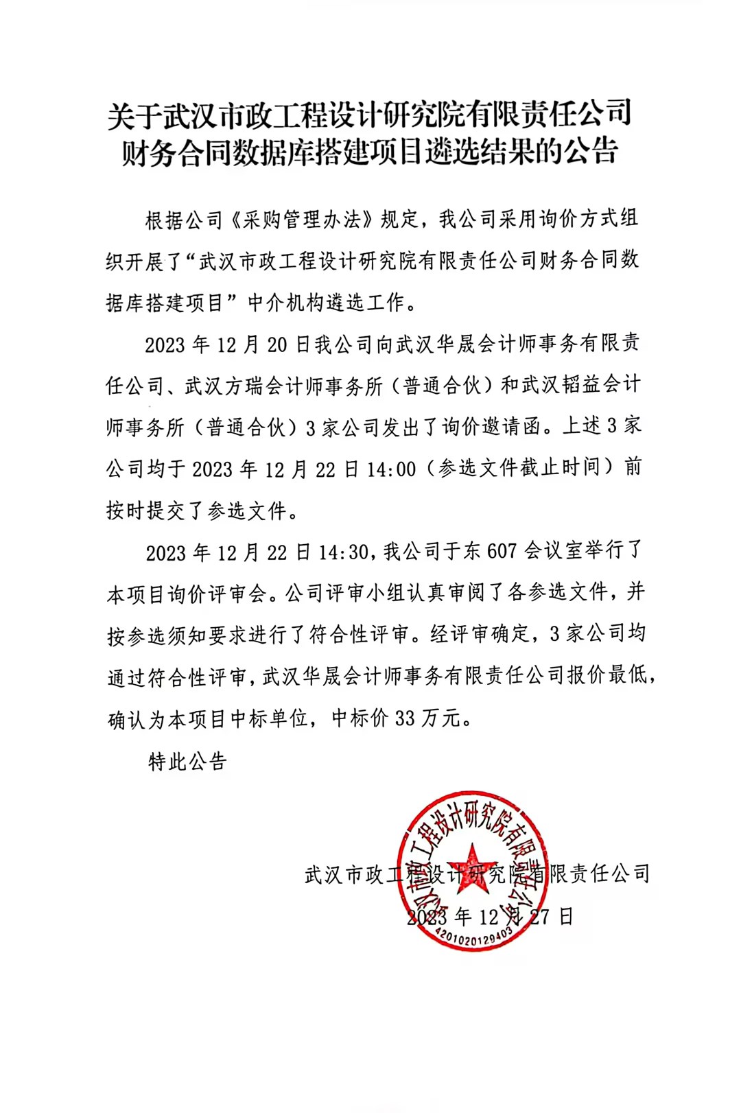 關于武漢市政工程設計研究院有限責任公司財務合同數據庫搭建項目遴選結果的公告