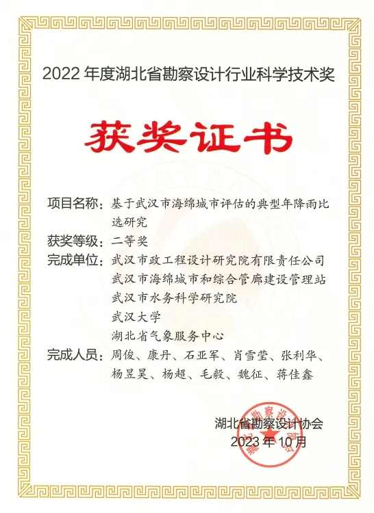依托“城市內(nèi)澇防治與水環(huán)境流域治理技術(shù)中試平臺(tái)”開展的《基于武漢市海綿城市評估的典型年降雨比選研究》獲湖北省勘察設(shè)計(jì)協(xié)會(huì)科學(xué)技術(shù)二等獎(jiǎng)