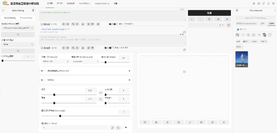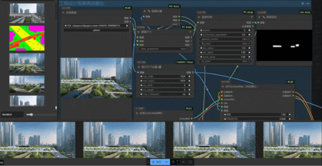 ? ? 武漢市政院在 AIGC 生成效果圖方案領域,通過深度學習算法優化與專業圖像數據訓練,搭建了市政工程效果圖方案自動化生成平臺1.0版,構建了路橋、建筑等專業圖像生成大模型的模型庫。平臺通過引入DeepSeek-R1 等前沿大語言模型,借助其強大的深度語義理解機制與多模態認知能力,可解構模糊設計意圖,自動生成符合工程規范與藝術審美的精準提示詞,突破傳統人工描述的主觀性與局限性;同時,依托自定義節點技術,成功開發并驗證了多套一鍵生成效果圖的高效工作流,為設計團隊提供了豐富的靈感和多元化的選擇。