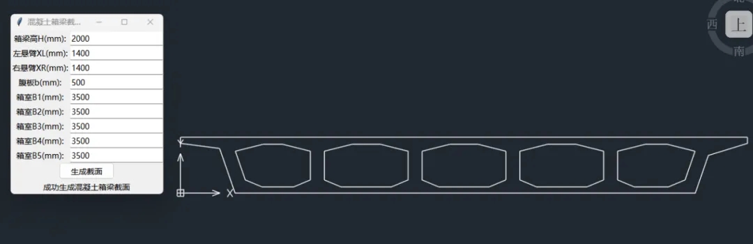 ? ? 武漢市政院實踐了多模態技術融合路徑——依托DeepSeek大模型深度工程語義理解與智能代碼生成框架,將混凝土箱梁截面的幾何參數標準、CAD二次開發規范等專業知識注入大模型認知體系,使其生成代碼框架。經過多輪調試,開發出參數化生成混凝土箱梁截面的小插件,能夠實現箱梁高度、懸臂長度、腹板寬度、箱室寬度等參數的設定,并配備可視化界面。