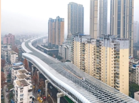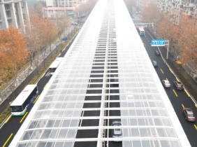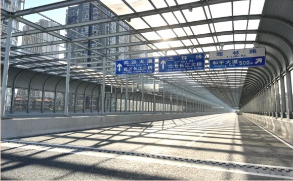 ? ? 項目設計團隊始終秉持 “輕量化、智能化、綠色化” 理念,多項技術應用填補區域空白,樹立行業新標桿。在鋪裝材料與工藝上,主線高架鋼箱梁橋面采用澆注式瀝青鋪裝,相比傳統方案減重16%,既降低橋梁結構負荷、提升安全性,又縮短施工周期;鋼箱梁采用U肋全熔透智能焊接,大幅提高結構疲勞壽命,積極推進鋼箱梁U肋焊接工藝的發展。尤為引人注目的是,本項目集中展現了三大創新亮點:它擁有全國最長的連續全封閉聲屏障,是湖北省首例“光伏+市政”的融合實踐,更在武漢率先實現了聲屏障光伏發電的應用,為綠色市政建設樹立了新的樣板。
