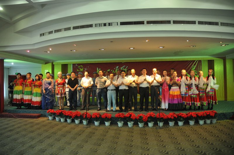 在莊嚴的《國際歌》中,總結表彰大會結束,一臺由公司黨員和入黨積極分子自編、自演的文藝演出正式開始,《再唱山歌給黨聽》、《長征》、《情深誼長》等精彩的歌舞節目贏得了觀眾的陣陣掌聲,演出現場洋溢著歡樂、喜慶的氣氛。演出最后,各位領導走到臺上,與全體演員和觀眾一起高唱《沒有共產黨就沒有新中國》,臺上臺下感情交匯,將現場氣氛推向高潮。
